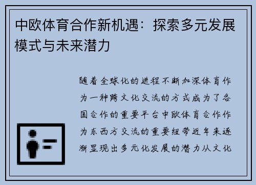 通过文化交流、技术创新、产业合作以及赛事合作等多个维度,中欧体育合作展现出了多元化和深层次的合作潜力。随着全球体育产业的蓬勃发展,中欧双方的合作必将在未来迎来更多机遇和挑战。在未来的合作中,双方需要更加注重跨文化的沟通和技术的创新应用,以实现共赢发展。